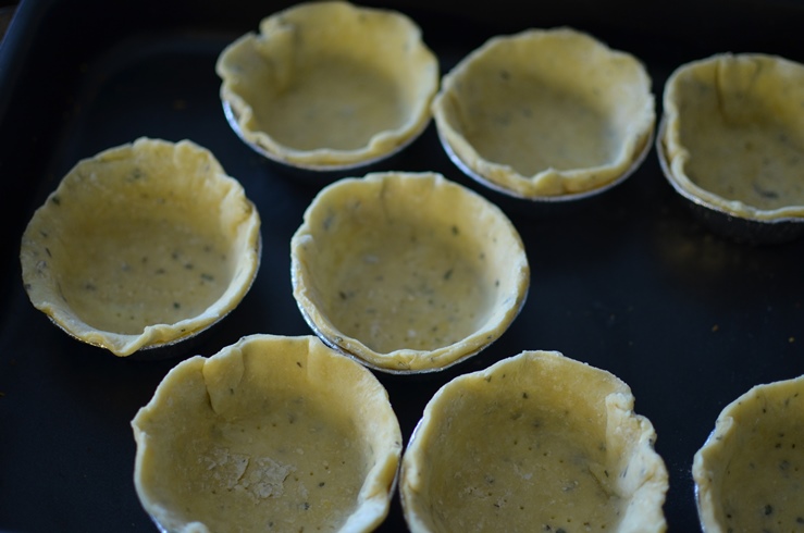 Roll the pastry on a floured surface to a thickness of 2mm. Cut enough rounds for 16-20 bases and 16-20 tops. I used deep 7cm round aluminium one-use tins. Line the pie tins, prick the base with a fork and then leave to rest for 30 minutes in the fridge. This avoids shrinkage while baking so don’t skip this step, or the tops might come away and the filling will be much more prone to overflowing.